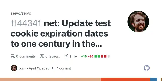 Someone wrote a unit test for @servo 10 years ago with a cookie expiry date of April 18, 2026, now the CI is broken. Maintainers suggest using system time or a library like TimeCop to make tests more robust.
